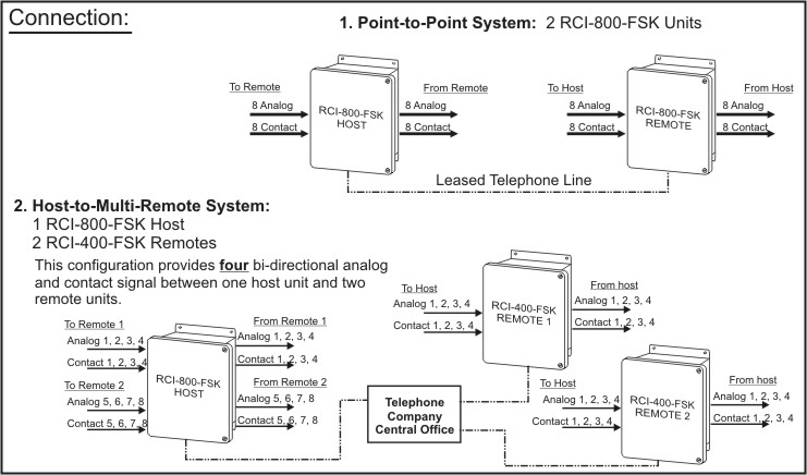Function: The RCI-200 is a bi-directional remote communication system that exchanges the status of 8 dry contact inputs and 8 analog inputs between a master and remote unit or a PC equipped with a modem. A basic system consists of